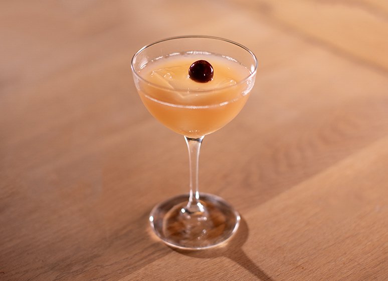 Glenfiddich Orchard Experiment whisky, egg white, lemon Juice, garnished with Somerset Morello Cherry soaked in eau de vie